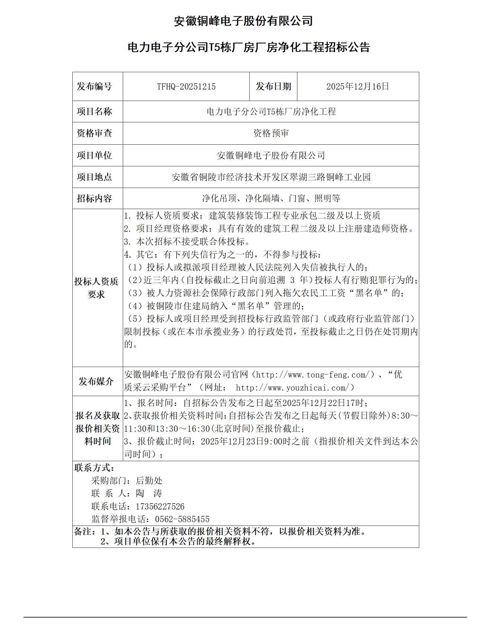 01安徽銅峰電子股份有限公司 (電力電子分公司T5棟廠房凈化工程 招標(biāo)公告)_01