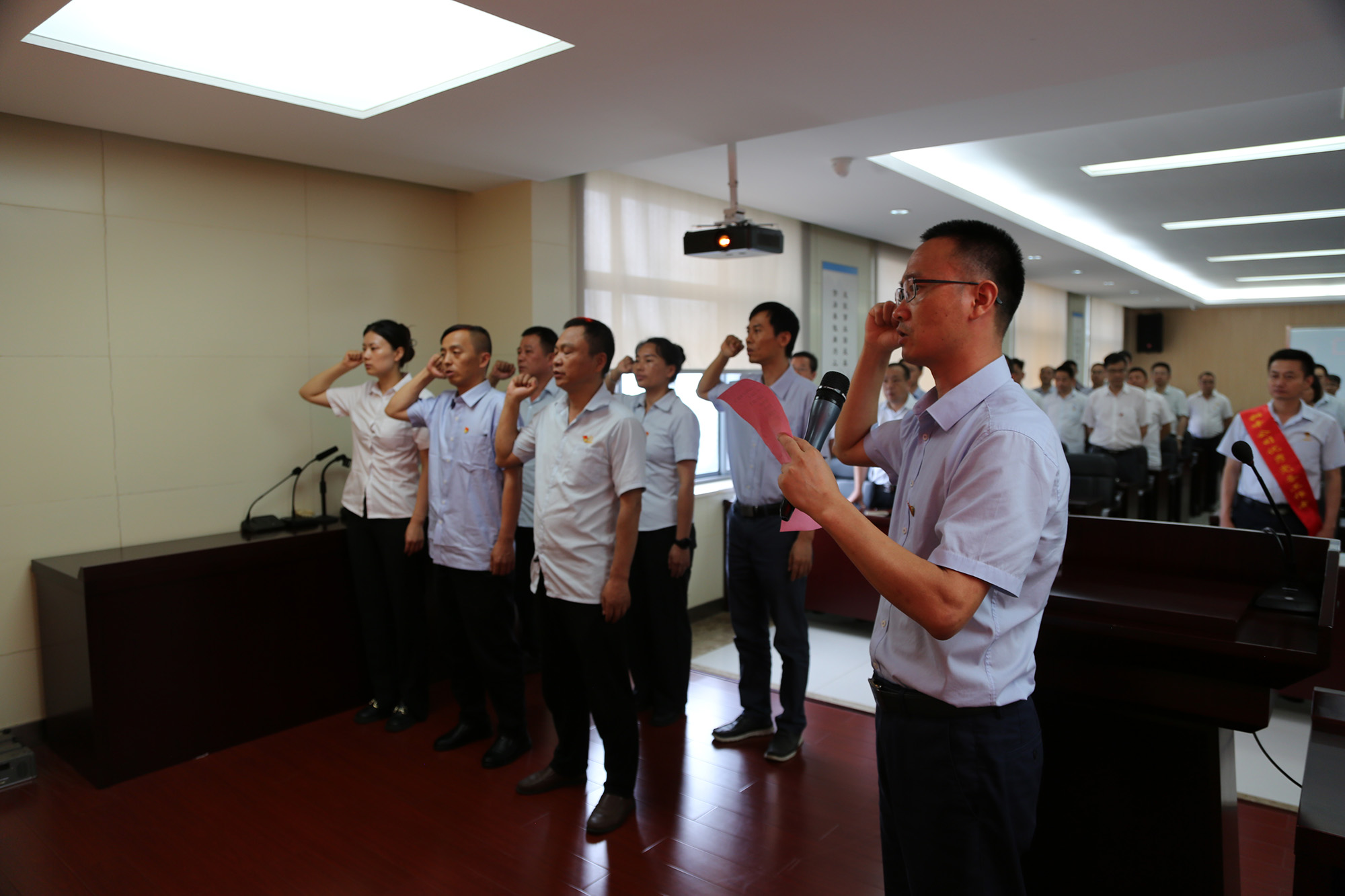 在首先進(jìn)行的新黨員入黨宣誓儀式上,黨委委員林政宣布新黨員名單,歡迎新黨員加入黨組織并向他們提出希望和要求。隨后,由黨委委員何曉明領(lǐng)誓,新黨員進(jìn)行入黨宣誓。在“兩優(yōu)一先”表彰環(huán)節(jié),公司黨委領(lǐng)導(dǎo)為受表彰對象頒發(fā)榮譽證書,“兩優(yōu)一先”代表分別作先進(jìn)事跡報告。