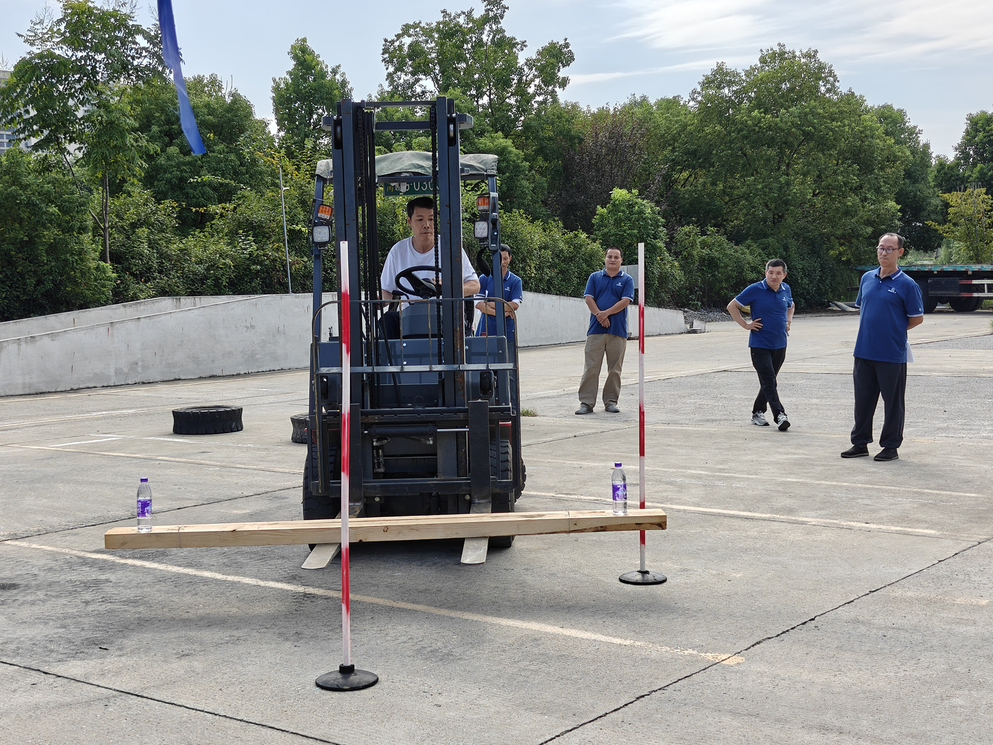 叉車(chē)技能比武側(cè)重于選手的操控熟練性與心理素質(zhì)。項(xiàng)目設(shè)置緊密貼合實(shí)際作業(yè)場(chǎng)景,要求選手在限定時(shí)間內(nèi)完成轉(zhuǎn)向往返、托盤(pán)精準(zhǔn)移庫(kù)碼放等動(dòng)作,并在繞障礙物操作過(guò)程中確保托盤(pán)上礦泉水瓶保持穩(wěn)定,不得掉落。競(jìng)賽不僅要求速度,更注重操作的平穩(wěn)性與準(zhǔn)確性,充分體現(xiàn)出高標(biāo)準(zhǔn)的作業(yè)要求。